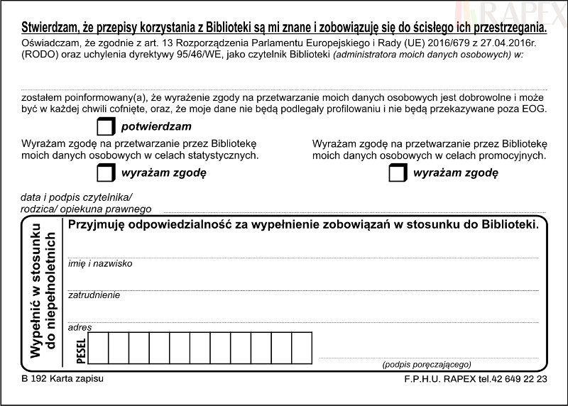 Nowy wzór karty zapisu do biblioteki, zgodny z wytycznymi RODO.